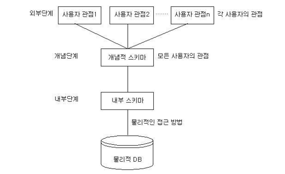 - 스키마는 사용자의 관점에 따라 외부 스키마, 개념 스키마, 내부 스키마로 나누어진다.