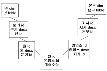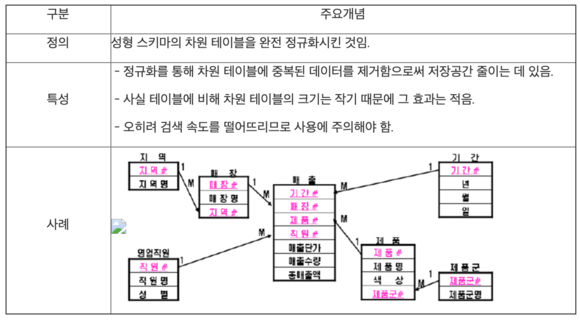 - 스타스키마에서 차원이 대용량일 경우 발생하는 처리속도 저하 문제를 해결하기 위해 제시된 데이터모델링 기법