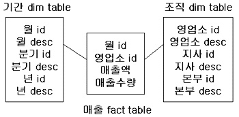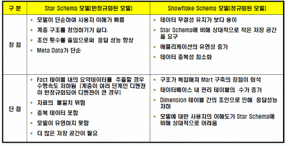 - 다차원 의사결정 지원 데이터를 관계형 데이터베이스로 전환하는 데 사용되는 데이터 모델링 기법