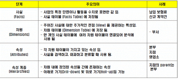 - 속성(ATTRIBUTE) : 각 차원의 테이블이 가지고 있는 속성. 사실을 검색하고 여과하고 분류할 때 사용됨.